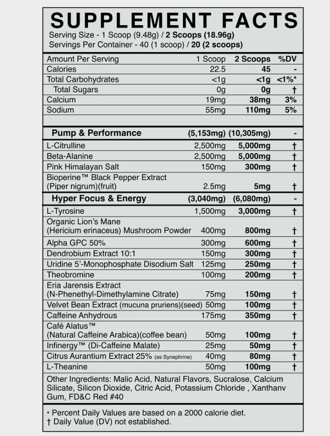 Featured Ingredient: L-Citrulline, Beta-Alanine, Organic Lion's Main, Uridine 5'-Monophosphate, L-Tyrosine, Alpha GPC, Dendrobium Extract, Eria Jarensis Extract, Citrus Aurantium, 485mg of Caffeine.