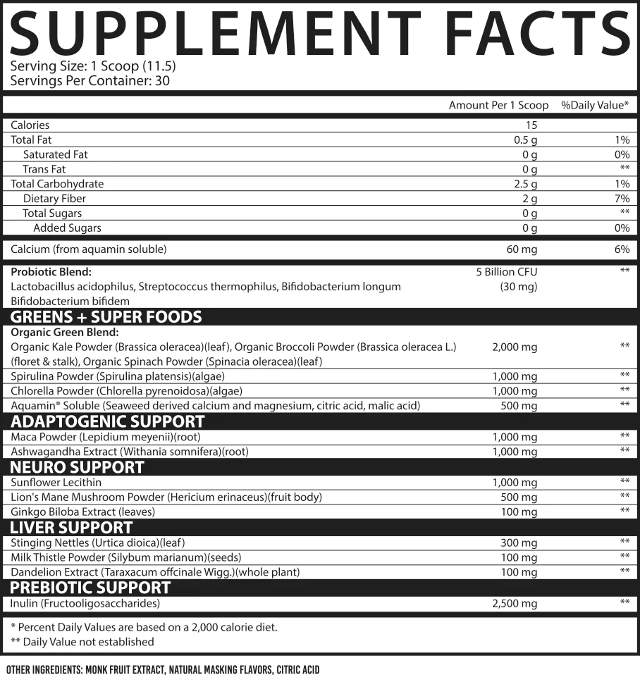 Each scoop delivers one entire USDA serving of organic vegetables, plus digestive, neurological, and liver support. Getting your daily greens in has never been easier.